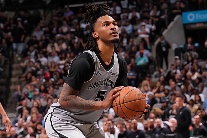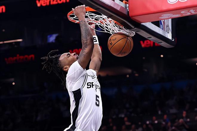 本场比赛中,马刺虽然最终有惊无险地战胜了对手,但是伤停9场后伤愈复出的后场新星斯蒂芬-卡斯尔(Stephon Castle)的表现并不理想。卡斯尔作为先发二号位全场出场23分03秒,投篮15中5,三分线外2中1,罚球8中7,得到了18分5篮板5助攻的数据,其中还包括了3个前场篮板,还有3次失误和4次犯规,正负值为-2。卡斯尔在进攻端也是得到了大量的出手机会,然而他的进攻选择并不合理,他的进攻效率也是一塌糊涂的水平,他也是浪费了不少机会。卡斯尔在失误控制方面也做得不太理想,他在防守端的表现也不是那么突出的水平。至少在本场比赛中,卡斯尔算是在攻防两端都没有起到效果,这也在很大程度上导致了球队一度陷入了被动之中。如果卡斯尔的表现稍微正常一些,马刺可能都可以更加顺利地拿下胜利。